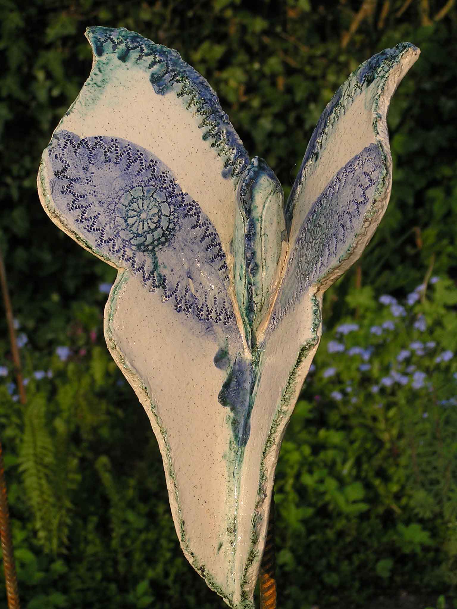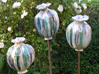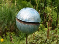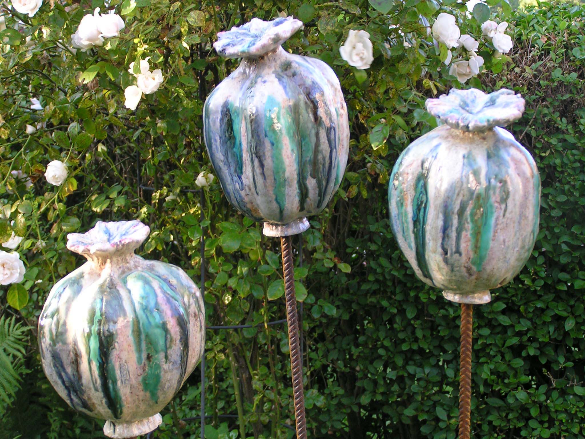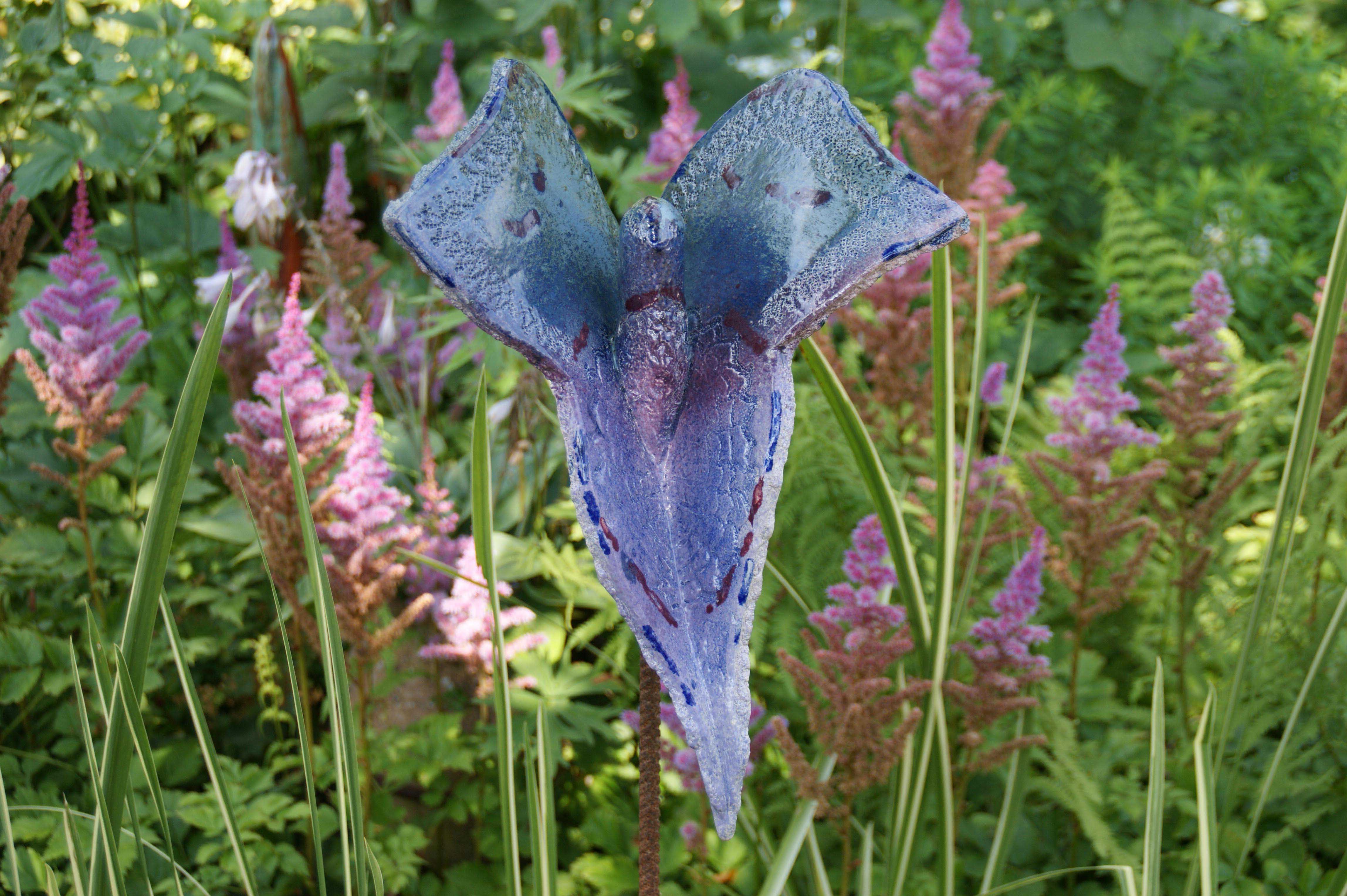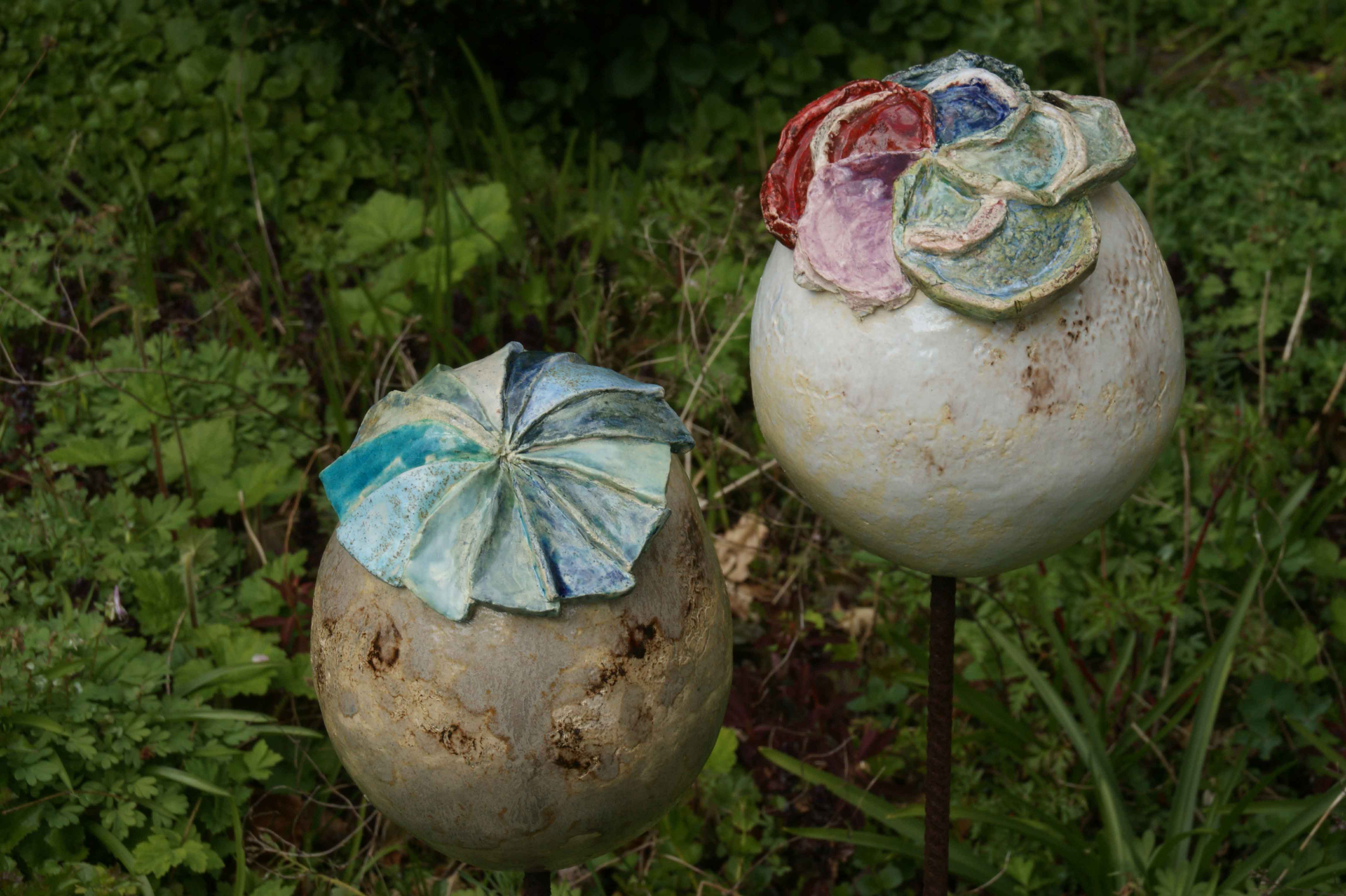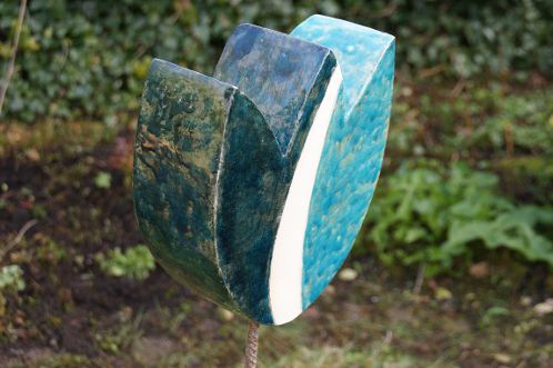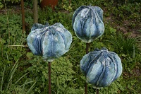 Voor de tuin maak ik vlinders, bollen en groeivormen. Mijn tuinobjecten plaats ik op ijzeren staven, die in de grond worden gestoken. In de lente steken ze nog boven het prille groen uit. Enkele maanden later zijn de tuinobjecten een onderdeel geworden van een fleurige zomertuin. Soms maak ik drie bijna dezelfde bollen of groeivormen, die als groepje in de tuin worden geplaatst. De staven lever ik bij de tuinobjecten en verroesten mooi in de loop der tijd.