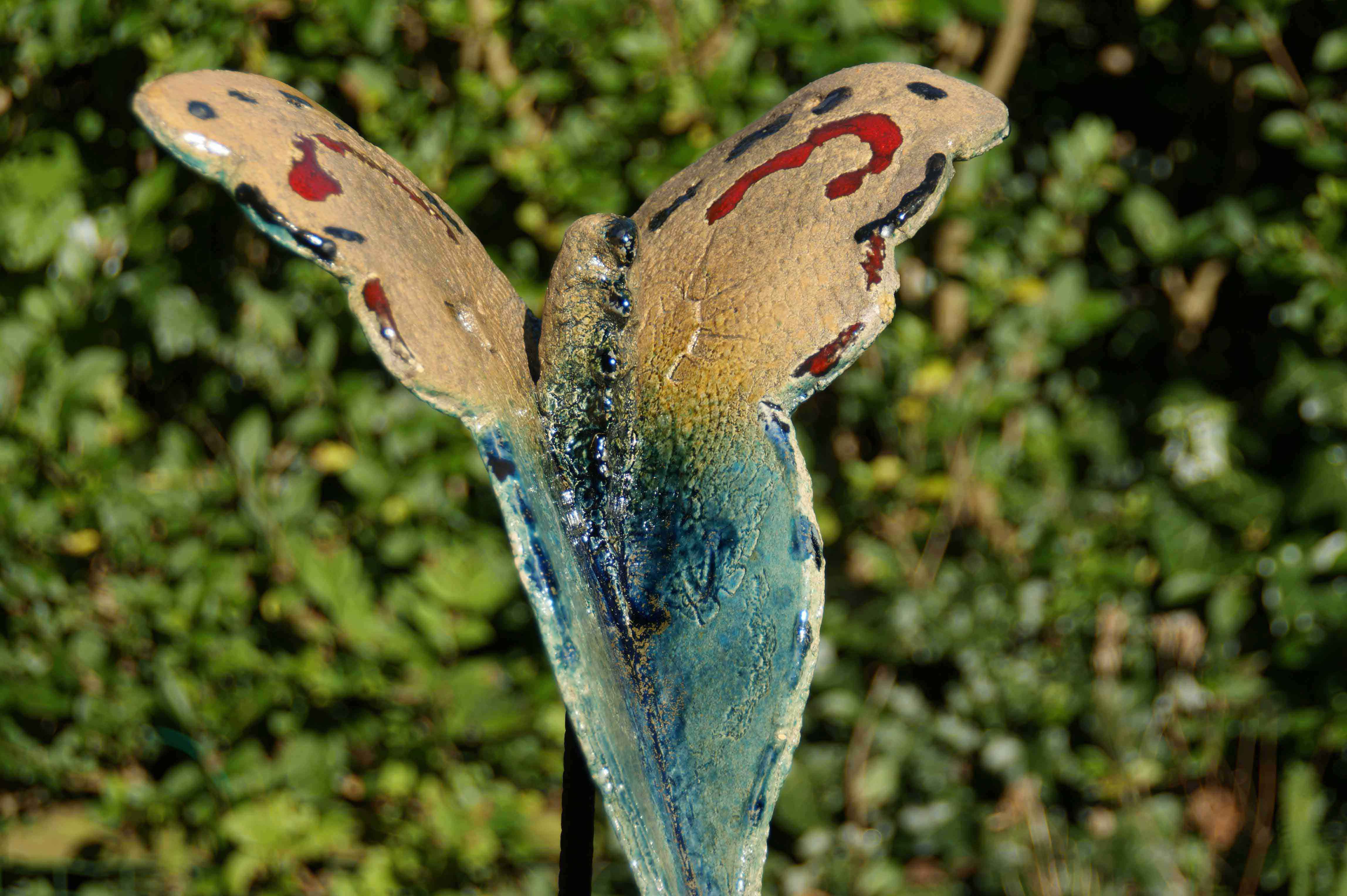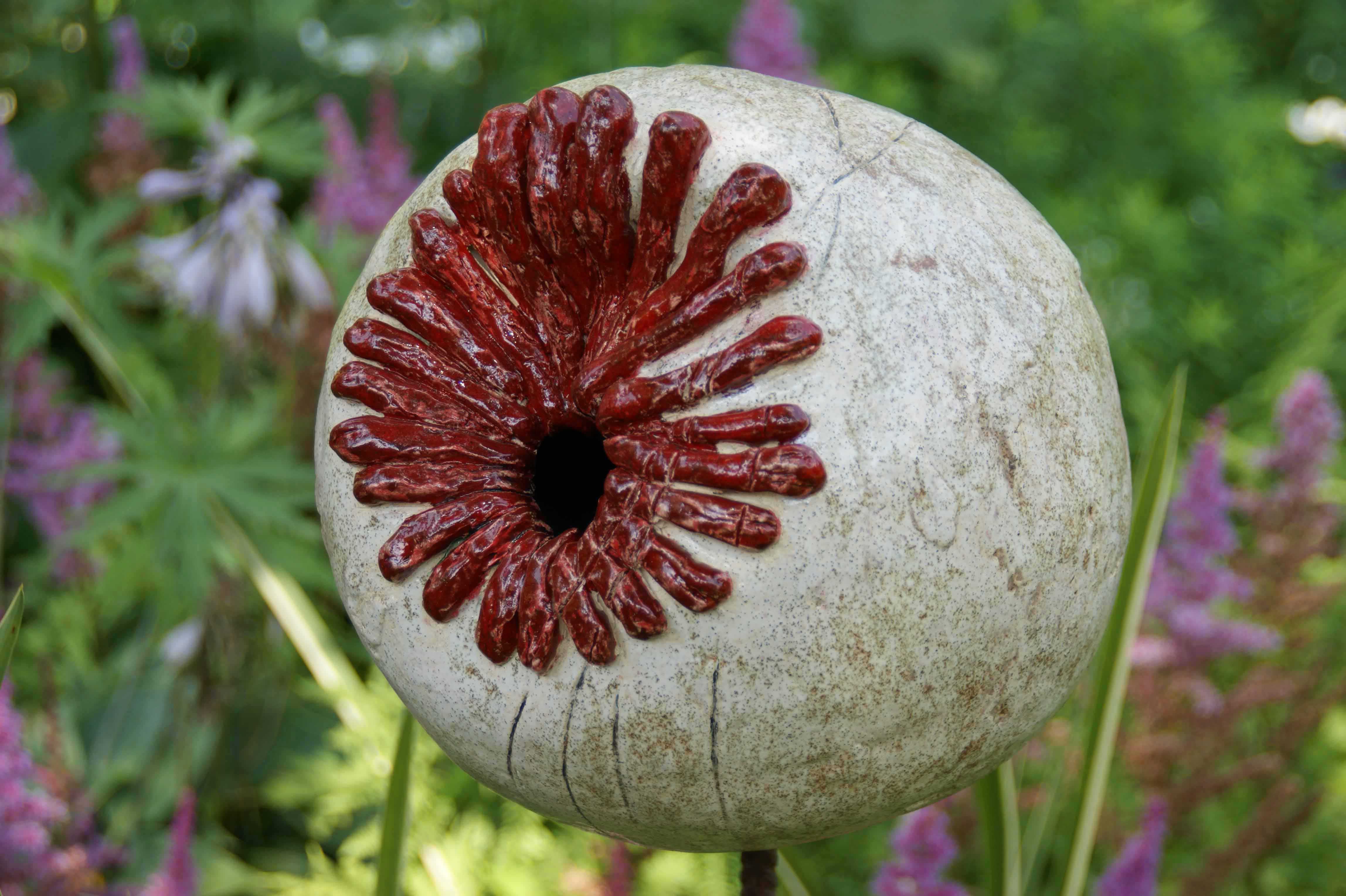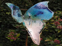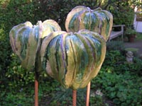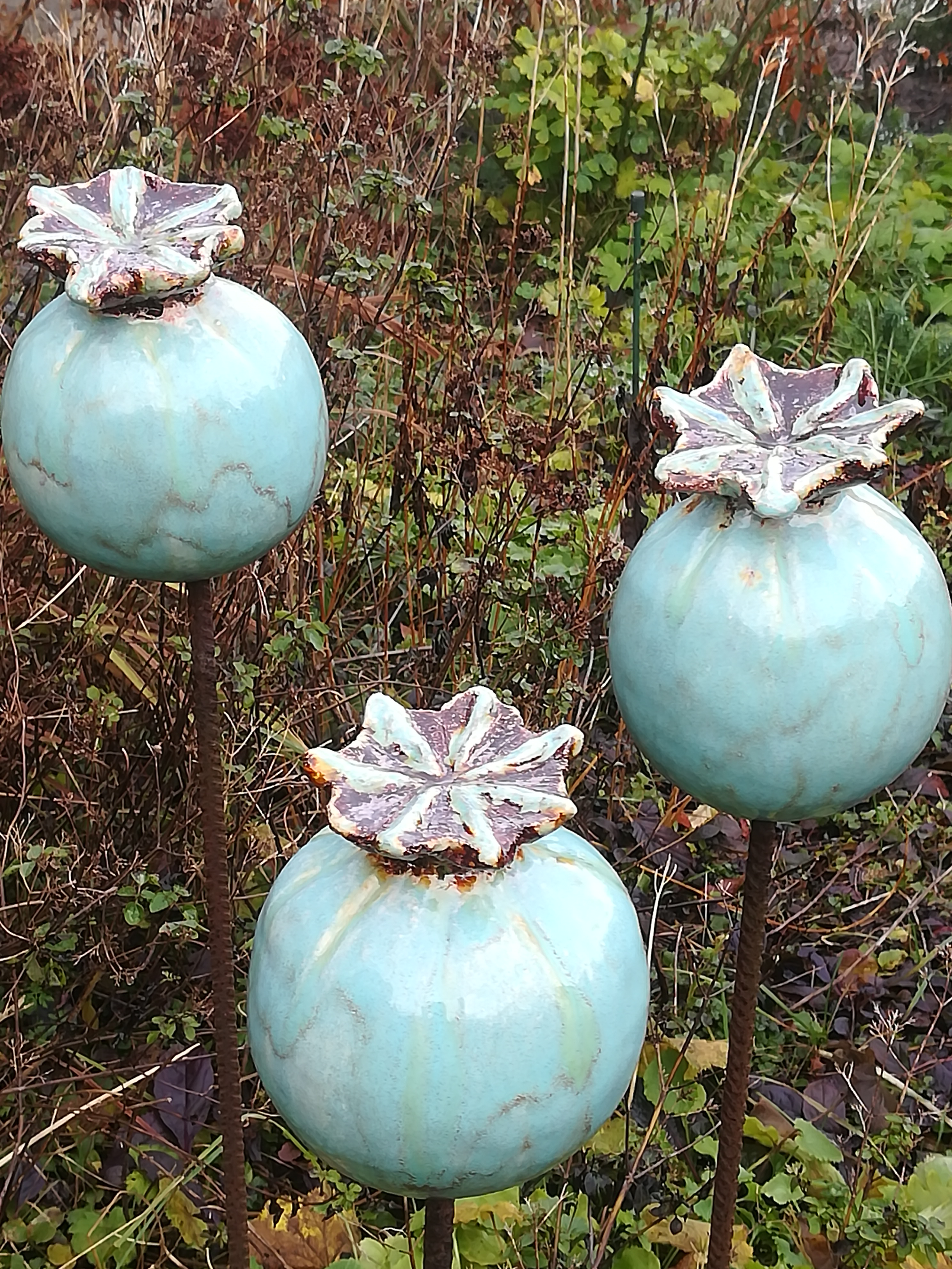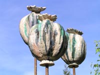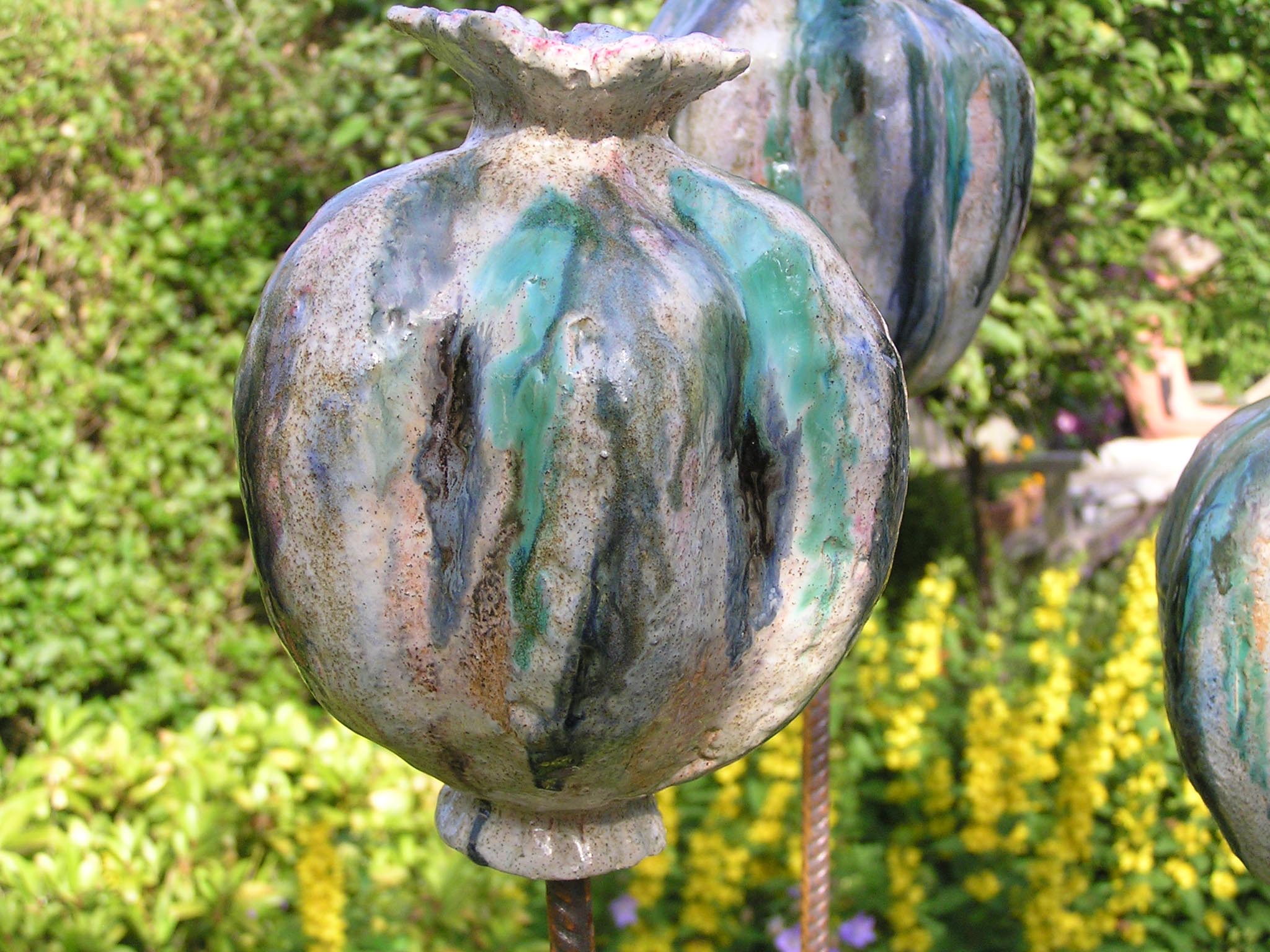 Voor de tuin maak ik vlinders, bollen en groeivormen. Mijn tuinobjecten plaats ik op ijzeren staven, die in de grond worden gestoken. In de lente steken ze nog boven het prille groen uit. Enkele maanden later zijn de tuinobjecten een onderdeel geworden van een fleurige zomertuin. Soms maak ik drie bijna dezelfde bollen of groeivormen, die als groepje in de tuin worden geplaatst. De staven lever ik bij de tuinobjecten en verroesten mooi in de loop der tijd.